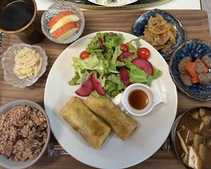 | 【 産後ケアの食事 】 魚、豆、海藻、きのこ、野菜、根菜をバランスよく、 たっぷり使用し、栄養士が栄養バランスを考えて 献立を立てています。 |